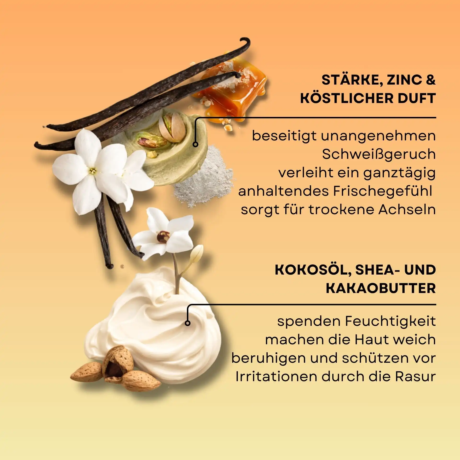 - Kokosöl und Kakaobutter schützen auf natürliche Weise vor Schweißgeruch